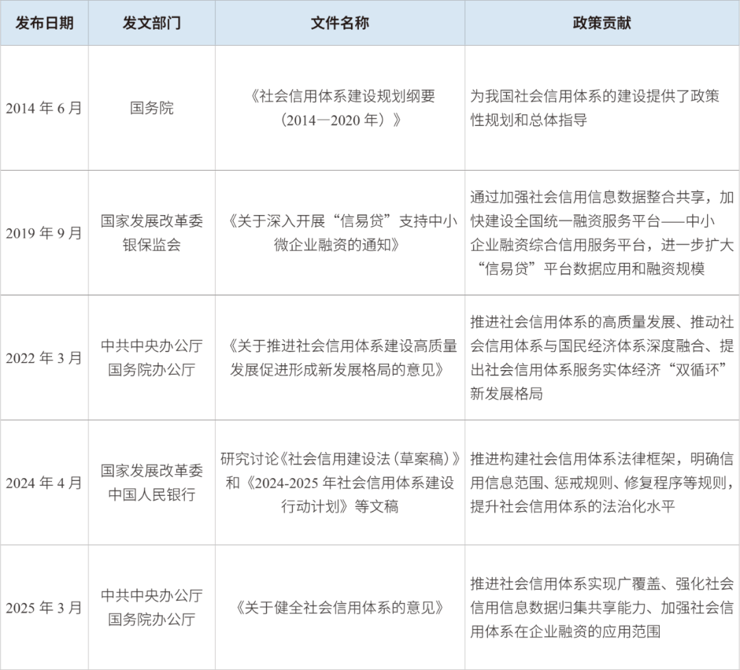 党中央、国务院高度重视我国社会信用体系的建设,陆续出台了一系列相关政策文件以推动社会信用体系的发展与推广应用,为社会信用体系在企业融资领域的有效应用提供了强有力的政策支持和保障。