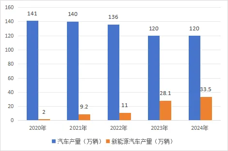 图1 2020—2024年武汉市汽车产量情况