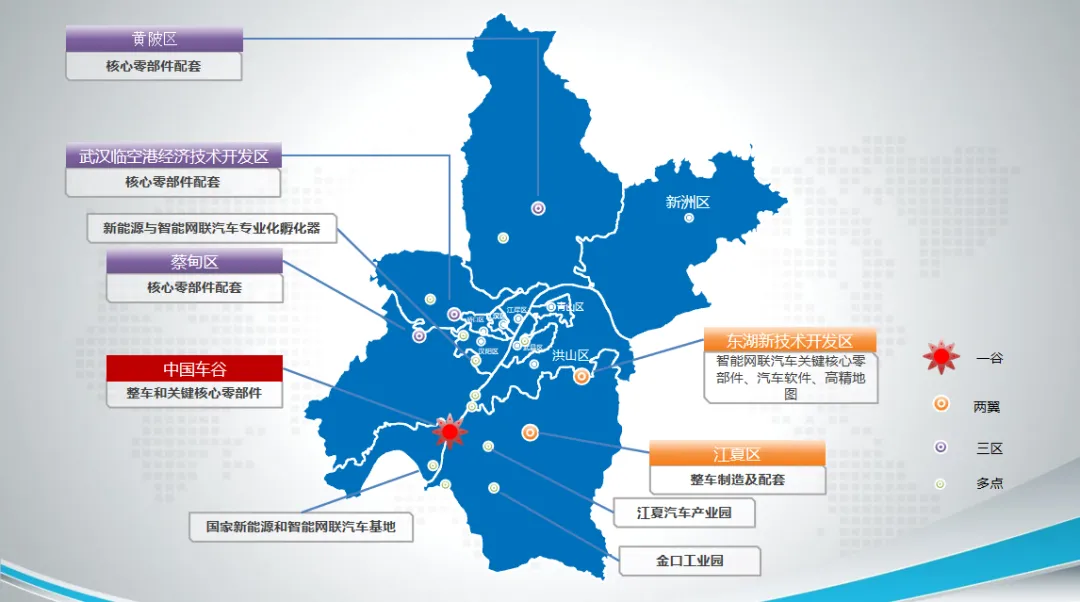 2 三区指的是武汉临空港经济技术开发区、蔡甸区、黄陂区;多点指的是武昌区的W+车联网产业园