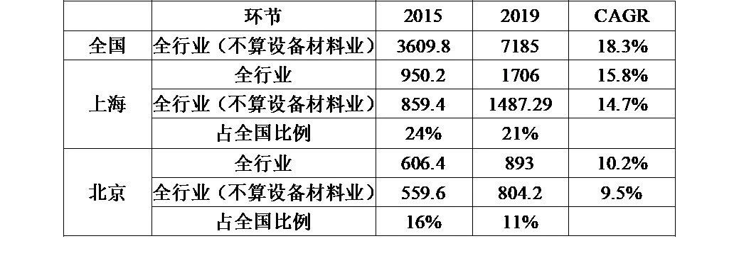表2:2015-2019年上海及北京集成电路各产业环节的收入及增速