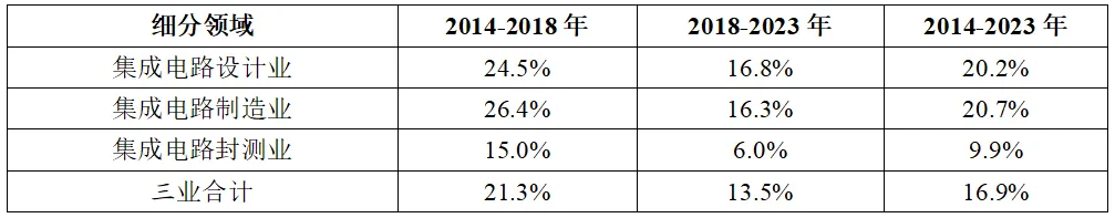 表2 2014-2023年我国集成电路产业三大主业销售收入年均复合增速情况
