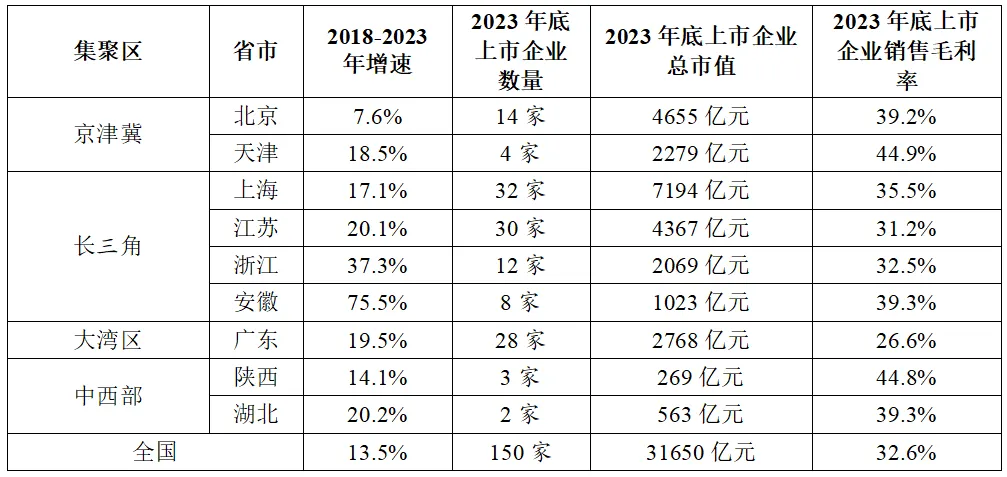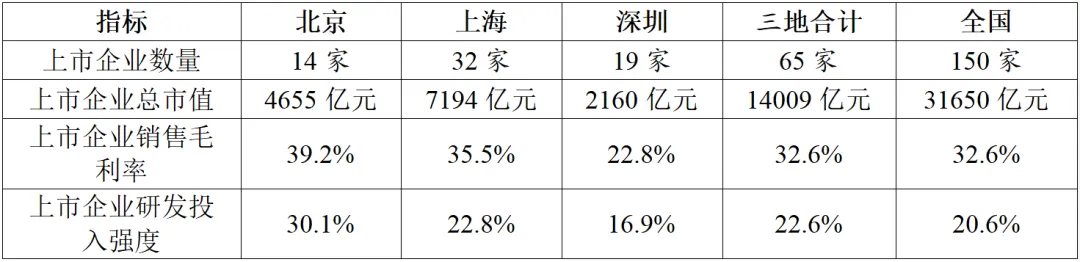 在企业发展方面,北京上市企业发展质量最高,上海上市企业数量和总市值最多。根据东方财富数据(表7),截止到2023年底,北京、上海、深圳分别拥有14家、32家、19家半导体领域的上市企业,总市值分别为4655亿元、7194亿元、2160亿元,合计上市企业数量和总市值占到全国的40%以上。其中上海上市企业的数量和总市值最多,而北京的上市企业发展质量最高,销售毛利率和研发投入强度分别达到39.2%和30.1%,远超全国平均水平。