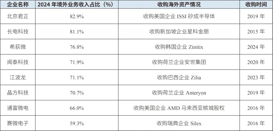 根据上市企业年报数据及所披露的境外业务信息,在境外业务收入占比大于50%的集成电路上市企业中,有接近1/3的企业是通过海外收购资产积极布局全球市场业务,实现境外业务收入的增长。例如本以国产处理器为核心业务的北京君正,收购ISSI矽成半导体后通过其海外销售网络和国际认证,芯片产品进入多家国际汽车品牌供应链,逐步提升在东南亚、欧洲等海外市场的竞争力,实现境外业务占比超过80%。此外,在海外投资自建以及与海外贸易商合作,也是我国集成电路企业出海的重要路径。