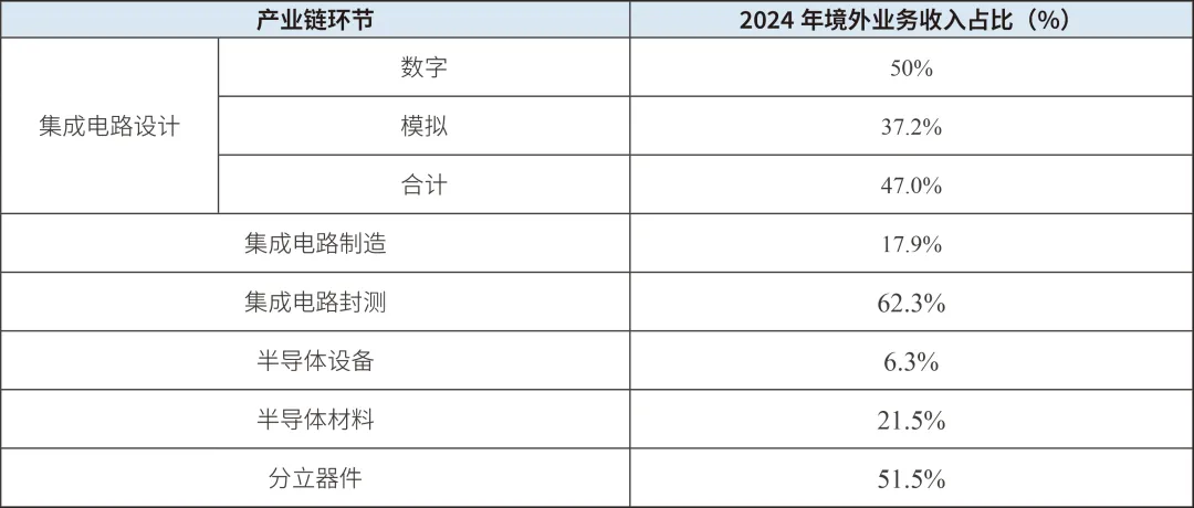 表2:集成电路各产业链环节上市企业2024年境外业务收入占比