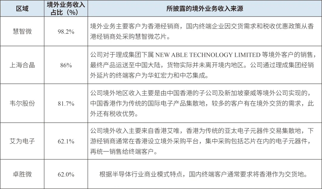 在我国160余家集成电路上市企业中,部分境外业务收入占比较高的企业在年报中披露,其境外业务客户主要以中国香港地区子公司或贸易公司为主,最终采购方仍为中国大陆客户,是以出口转内销为主的“假出海”现象。企业将其收入“境外化”的主要原因在于可利用香港的税制优势降低产品整体税负,此外香港地区作为传统的国际电子产品集散地,较多客户也有在境外交货的需求。