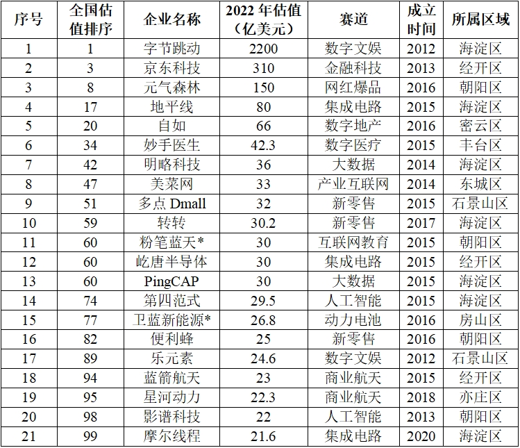 表1 2022年全国估值前100的北京独角兽企业
