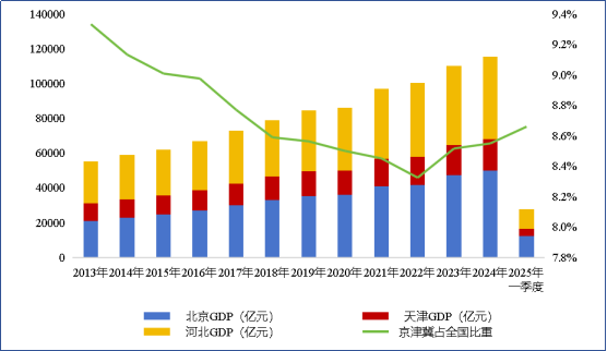 图1 2013-2025年一季度京津冀三地GDP及全国占比情况