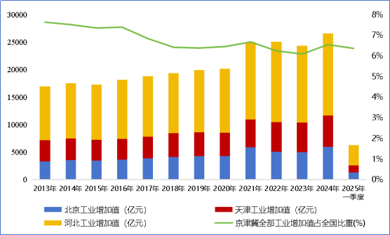 图2 2013-2025年一季度京津冀地区全部工业增加值变化及全国占比情况