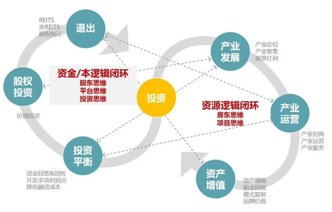 产业地产并不是产业+地产的简单组合,而是具有丰富逻辑内涵的特色经济形式。在实际投资实践中,要不断优化商业模式,扩充收益点,控制融资成本,把握生命线,通过土地资产化、资产资本化、资本证券化的逻辑循环,搭建资金/资本的逻辑闭环;同时,产业主导决定了产业集聚的可行性与投资退出的一致性,专业运营决定了现金流回流的可预期性以及最后资产不良的可能性,通过产业服务和运营促进产业集聚资产增值实现退出,搭建产业资源的逻辑闭环。