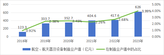 图1 近5年北京航空、航天器及设备制造业产值及占比情况