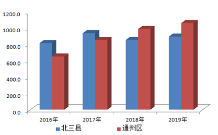 图1 2016年-2019年北三县和通州区地区生产总值比较(单位:亿元)