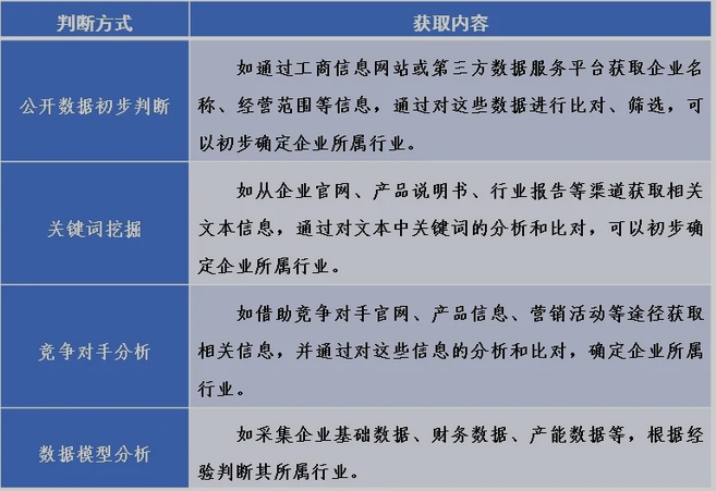 一般纳税人提供加工、修理等服务,增值税率通常为13%,而服务业为9%、6%,故此可要求企业提供其销售产品开具的增值税发票,制造业企业产品一般为有形产品,通过其增值税发票可识别税率、产品名称,进而进行判断。 合同信息佐证 可要求企业提供其销售合同以及本地生产条件照片,从生产场地和销售产品类型佐证。 结合以上三类判断方式,公开数据筛选可首先排除非制造业企业,再结合企业提供材料的情况用税务信息或合同信息进行具体判断。 总结 上述方法并不能毫无风险地精准判断规模以下企业是否属于制造业,同样也存在误判风险。但在需判定规下制造业企业样本量不大的情况下,不失为一种效率高、风险小、企业负担小的可行方法,同时辅助企业自证说明等相关材料,可基本满足认定审核的需求。 作 者 富迎辉:咨询工程师(投资),综合评估研究方向 班日:助理咨询师,综合评估研究方向 于洋:初级咨询师,综合评估研究方向
