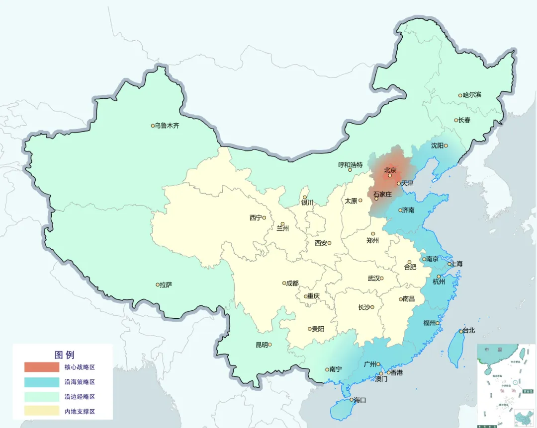 核心战略区:北京、天津、河北(雄安);沿海策略区:辽宁、山东、江苏、上海、浙江、福建、广东、广西、海南、香港、澳门、台湾;沿边经略区:广西、云南、西藏、新疆、内蒙古、黑龙江、吉林、辽宁;内地支撑区:贵州、重庆、四川、青海、甘肃、宁夏、陕西、山西、河南、湖北、安徽、江西、湖南。