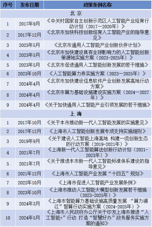 一、上海、北京发布人工智能产业政策数量领先,上海政策类型最为丰富
