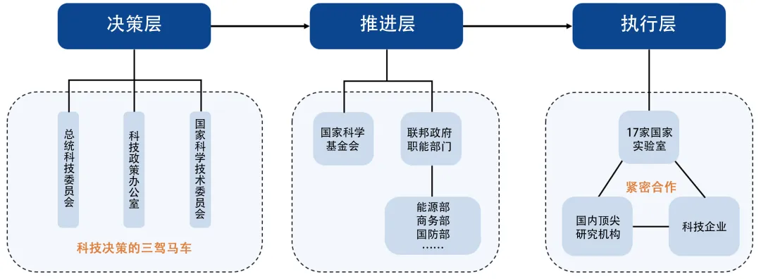 美国政府及人工智能发展推进机构分为决策层、推进层和执行层。决策层承担提出政策建议、决定政策方向的任务,包括总统科技顾问委员会(PCAST)、科技政策办公室(OSTP)和国家科学技术委员会(NSTC),这三个机构被称为联邦政府科技决策的“三驾马车”。推进层负责落实政策、推进项目,以能源部、商务部等职能部门以及美国国家科学基金会(NSF)为核心。执行层主要由能源部管辖的17家国家实验室构成,将研究资源输送到人工智能各细分领域,与顶尖高校等研究机构和前沿科技企业合作共同开展前沿科研工作。