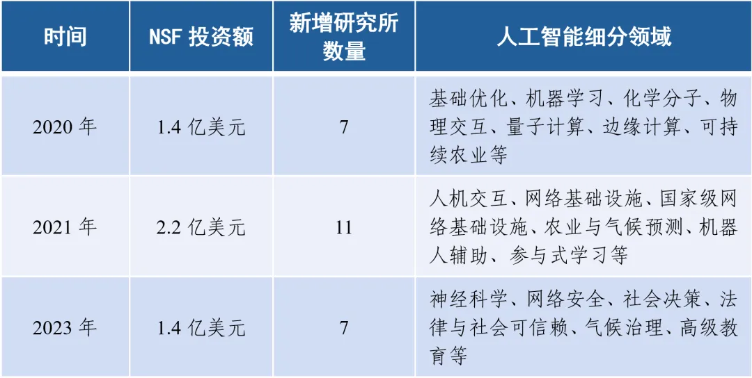 2020年起至2024年3月,美国国家科学基金会共出资5亿美元建设25家国家人工智能研究所,专注于气候、教育、医疗、网络安全等人工智能应用领域。国家人工智能研究所由美国顶尖高校领导,成为人工智能科学研究的前沿阵地和推动人工智能技术各领域应用的中坚力量,这种合作模式加强了科研的深度和广度。