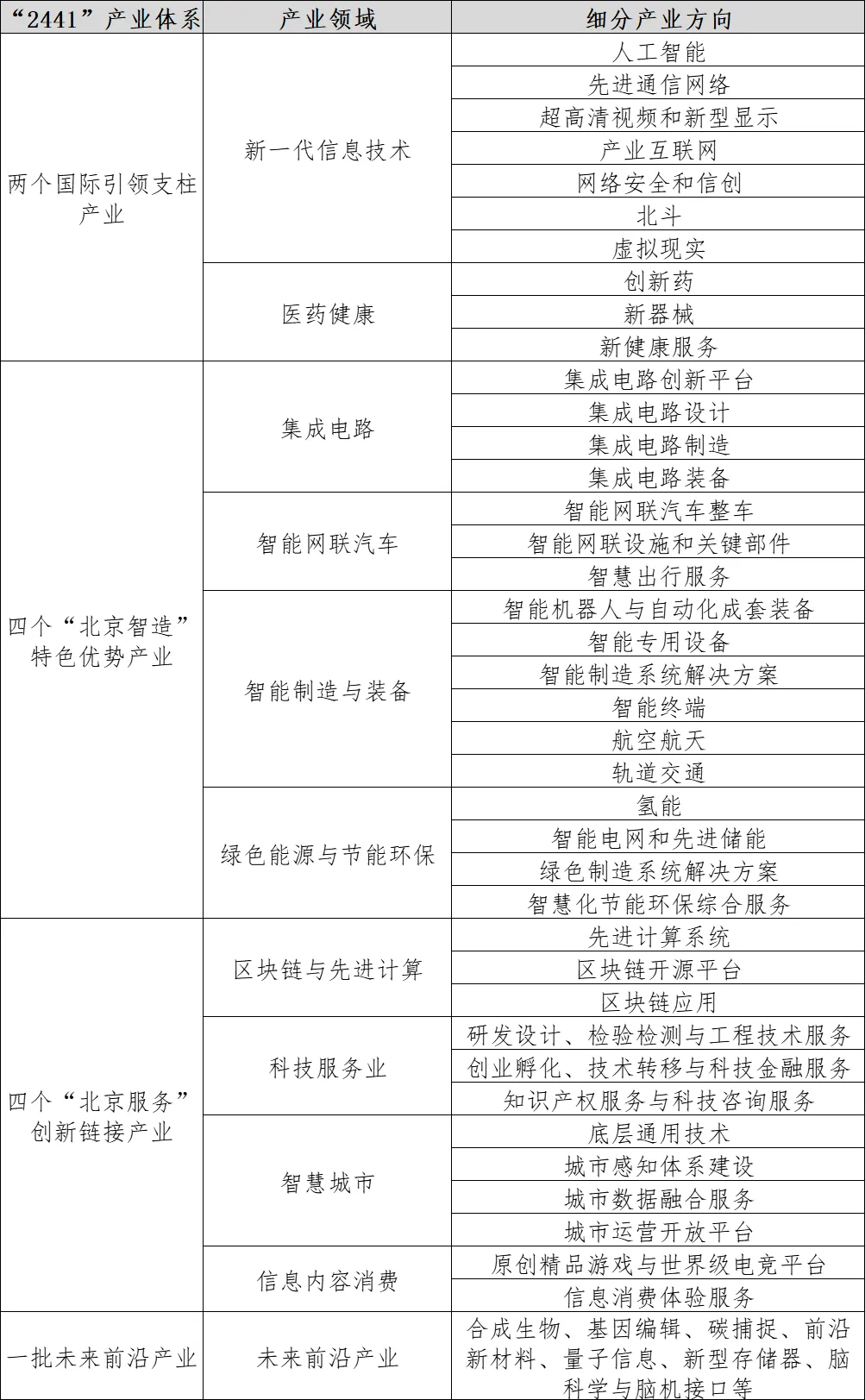 北京市高精尖产业体系以新一代信息技术、医药健康等重点产业领域为基底,并在政策设计中,逐步明确各产业领域的重点细分方向,以作为推动产业能级提升和结构优化的抓手。具体细分方向情况如下。