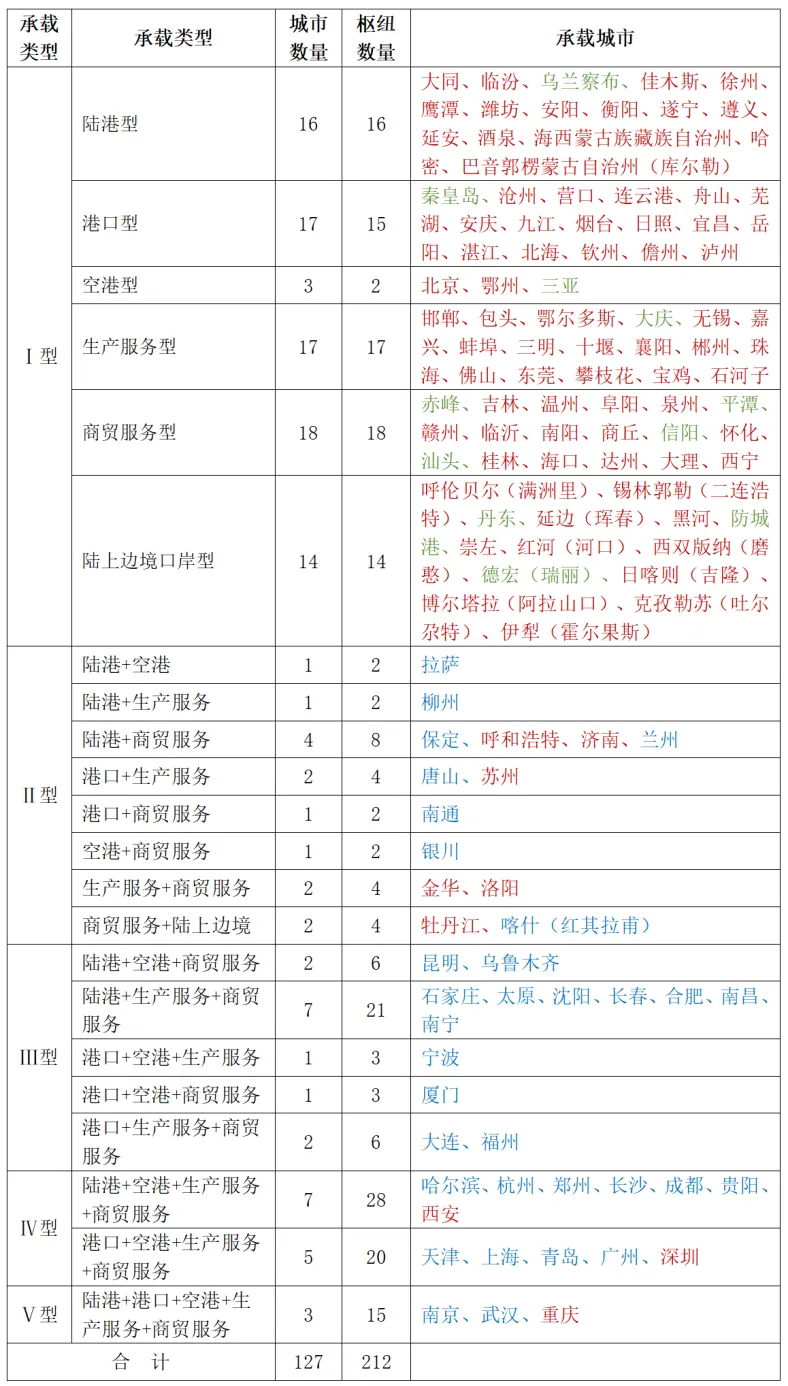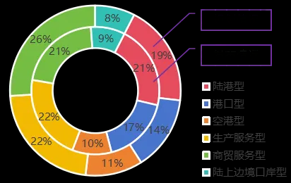 从类型看,规划枢纽包括六类,分别是41个陆港型、30个港口型、23个空港型、47个生产服务型、55个商贸服务型和16个陆上边境口岸型。按枢纽功能实现方式的差异性,分为物流功能模式和产业发展模式,前者依托地区交通禀赋和主通道网络,包括陆港型、港口型和空港型;后者按照地区经济发展路径,包括生产服务型、商贸服务型和陆上边境口岸型。