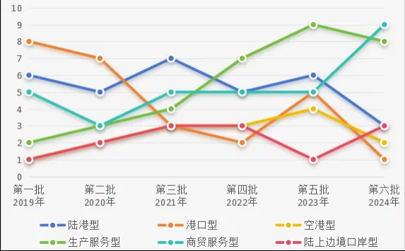 已发布枢纽的类型结构以陆港型、生产服务型和商贸服务型为主,与规划布局大体一致。近三年枢纽建设类型已逐步向生产服务型和商贸服务型偏移,商贸服务型2024年发布数量取得爆发式增长,但总体占比相较规划布局仍略有偏差,未来仍属建设重点。
