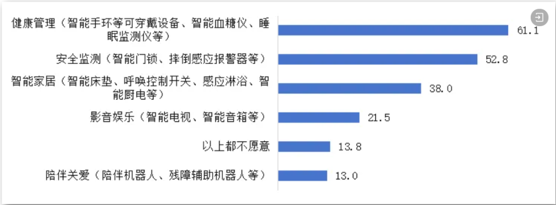 从北京市老年人口结构看,2023年北京市“新老年群体”约285.7万人5,占常住老年人口的57.7%。失能失智老年群体约32.06万人。从北京市养老消费看,据《2024年北京市老年人消费调研报告》显示,全市老人理性消费占主导,注重自身实际需求和商品性价比。但消费领域较为多样,保健出游休闲为首选,智能产品接受度提高。