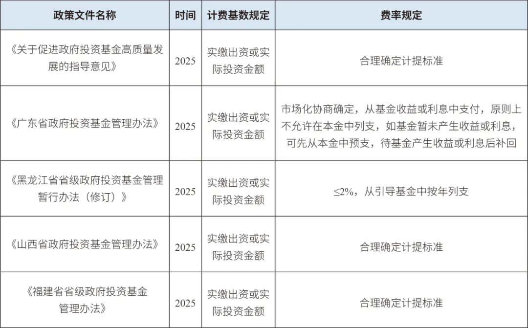 近年来,计费基数呈现从“认缴规模”向“实缴出资”或“实际投资金额”转变的趋势。2025年《国务院办公厅关于促进政府投资基金高质量发展的指导意见》明确新设政府投资基金的管理费一般以此为计费基础,随后,广东、黑龙江、山西、福建等省份新制定的管理办法均同步响应。