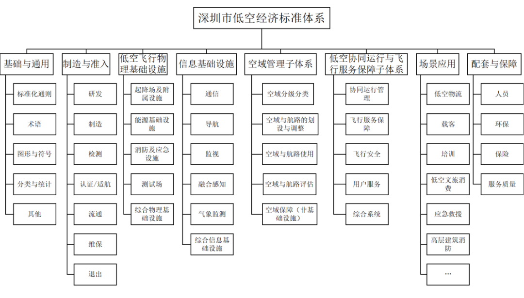 二是制定标准体系框架推动低空物流规范化发展。2024年8月,深圳成立了全国首个地方级低空经济标准化技术委员会,同年12月发布了《深圳市低空经济标准体系建设指南1.0》,从基础与通用、制造与准入、低空飞行物理基础设施、信息基础设施、空域管理、低空协同运行与飞行服务保障、场景应用、配套与保障8个角度规划了深圳低空经济标准体系框架,为后续低空经济系统性发展提供了依据。