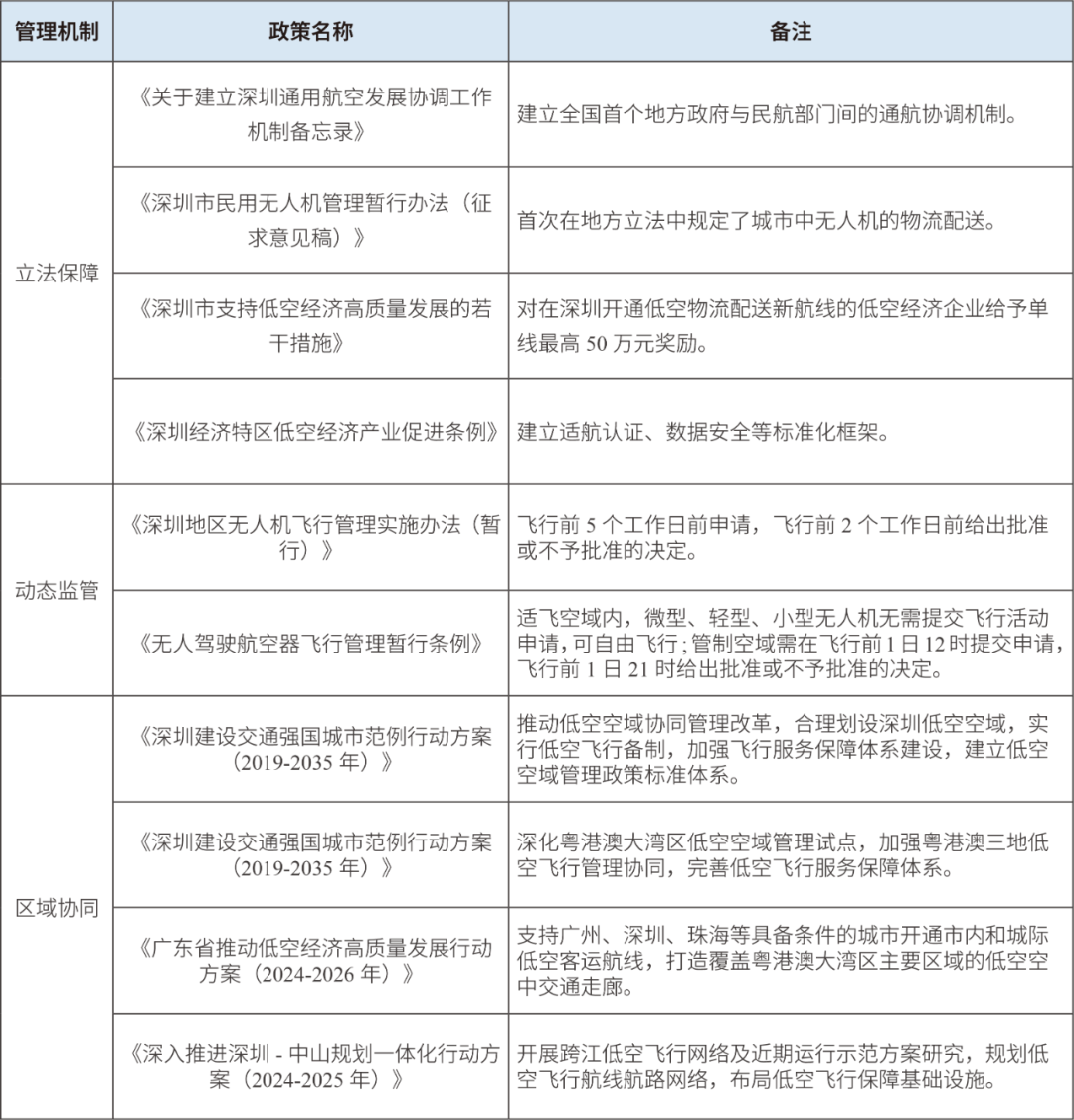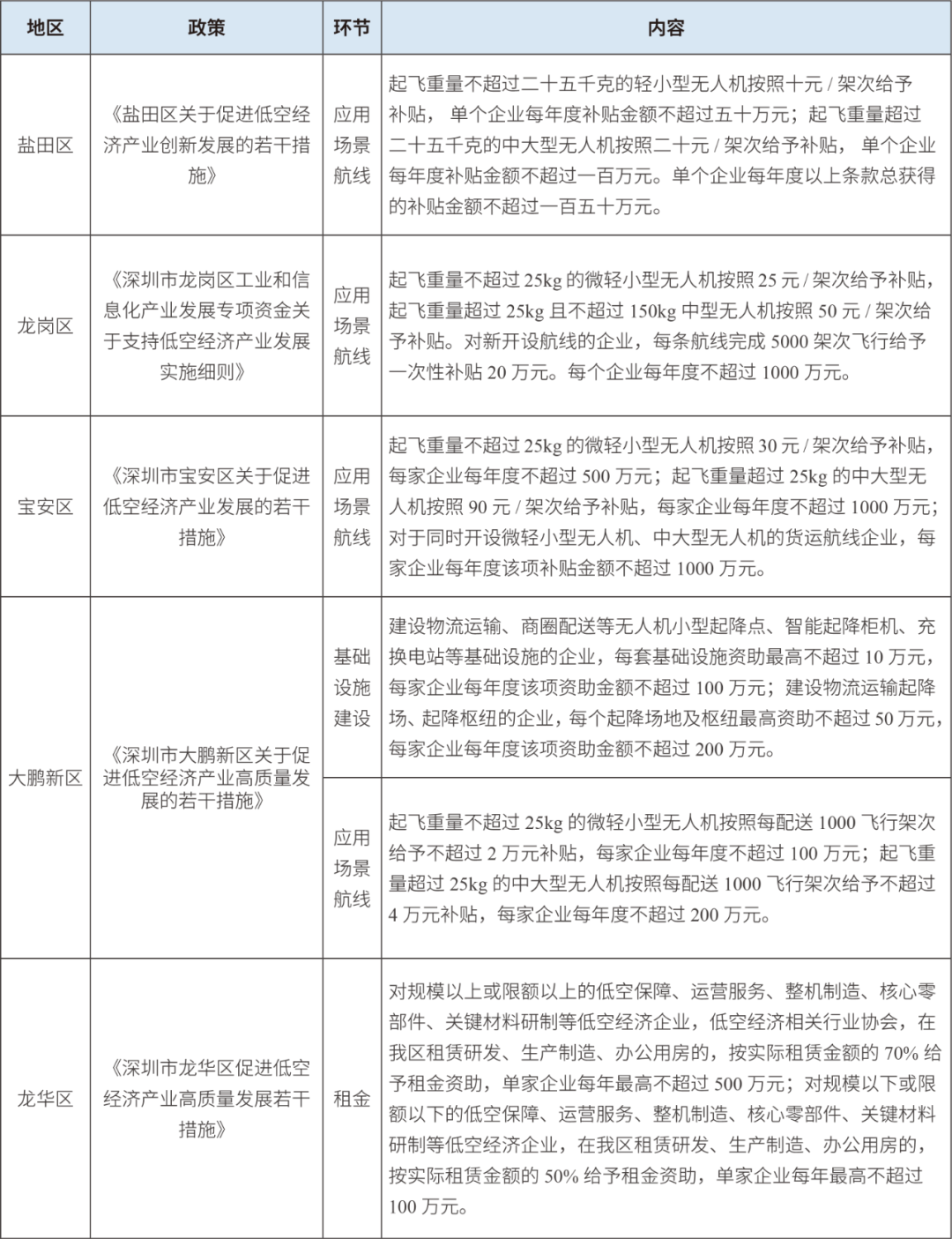 一是谋划低空经济顶层设计。作为经济特区,深圳充分发挥独立立法权出台了《深圳市民用无人机管理暂行办法(征求意见稿)》等政策法规,从民用无人机管理、适航认证、通航协调等方面为无人机物流发展提供立法保障。深圳市通过设立专项资金、给予建设与运营补贴、贴息贷款等方式为无人机相关企业提供资金支持;对于新入驻各区低空产业园区的企业,提供租金补贴,吸引核心零部件企业落地生产。