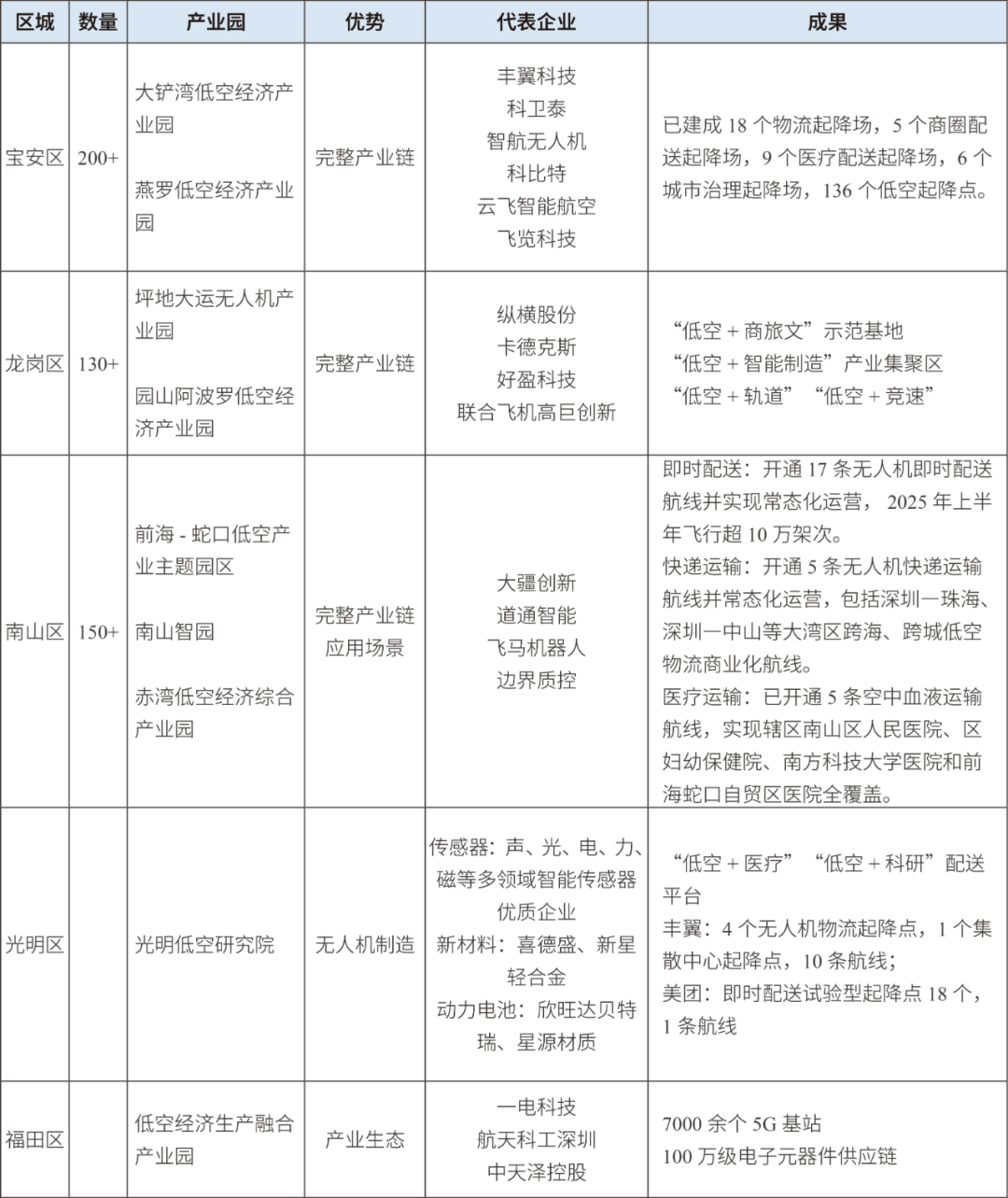 深圳是我国无人机产业集聚度最高的地区,各区依托各自产业基础及优势差异化布局开展低空经济产业。光明区依托光明科学城在信息、生命及新材料方面的优势,发展无人机大模型训练、高性能芯片以及新型材料等,重点布局无人机制造领域。福田区成立全国首个“低空经济生态融合产业园”并依托“中国电子第一街”华强北打造“热带雨林”创新创业生态,落地全国首家全产业链无人机设备选品中心,聚集200多家物流企业,年交易额超2000亿元。南山区设立三个低空经济产业园,分别专注航空器维修等低空业态、产业链优势企业及无人机产品测验,同时不断开拓应用场景,在即时配送、快递运输及医疗运输等方面形成了常态化运营。盐田区及大鹏新区主要布局eVTOL产业,成立了全国第一个eVTOL产业园区,建设了全国首个融合空域运行示范基地。
