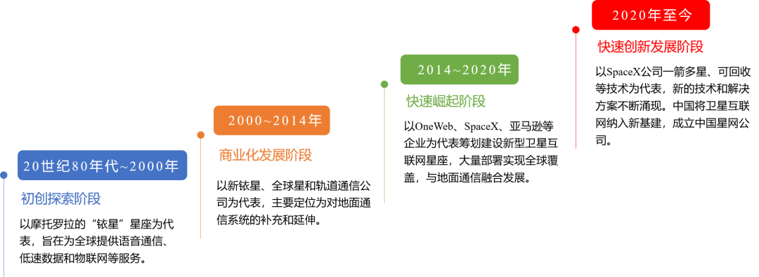 卫星互联网是当前乃至未来相当长一段时期大国竞争的新高地,是我国新型基础设施的重要领域,是构建天地互连网络的重要组成部分。当前,全球主要国家及头部商业企业正积极抢占产业发展先机,构筑竞争壁垒。 一、卫星互联网基本情况 (一)卫星互联网概念及构成 卫星互联网是一种基于卫星通信技术构建的全球性互联网系统,通过卫星组成的网络实现全球范围的覆盖,满足偏远地区、海洋、航空航天等通信需求。 卫星互联网由通信卫星、地面接收站和用户终端构成。通信卫星是卫星互联网的核心,它通过自身天线与地面终端连接,负责接收用户发送的数据,并将数据发送到目标地点;地面接收站是接收卫星信号的设施,将卫星传输的数据转发到互联网或其他目标设备;用户终端包括个人电脑、智能手机、卫星电话等设备。 (二)卫星互联网特点 1.广覆盖:提供覆盖全球的互联网 卫星互联网通过卫星信号实现全球范围的网络覆盖,克服地理限制,实现偏远山区、沙漠、海洋等人口稀少或地理环境恶劣地区的互联网连接,是地面通信网络的补充和延伸。具备灵活性和快速启动等优势,可以作为自然灾害或紧急情况下的有效通信方式。 2.低时延:降低网络的传输延时 卫星互联网低延时的特点使其成为全球范围内实时通信和数据传输的理想选择。通过利用部署在近地轨道的卫星网络,数据信号的往返传输时间被缩短至几十毫秒的水平。在银河航天首发星测试中,典型的延时值在20~40毫秒之间,可以与地面光纤网络媲美。卫星互联网的低延时对金融交易等对于即时数据传输和快速响应需求高的应用场景具有重要意义;同时,低延时的优势在长距离传输中尤为明显,为全球范围内的通信提供可靠的解决方案。 3.宽带化:提供高带宽容量的宽带服务 通过采用高频段通信技术、多点波束和频率复用等先进技术,卫星互联网的通信能力得到显著提升。一方面高频段通信技术提供更广阔的频谱资源,使得卫星互联网能够实现更高的信息传输速率,满足高信息速率业务的需求。另一方面,多点波束技术使得卫星能够同时与多个地面终端进行通信,提高频谱利用效率和资源分配的灵活性。此外,频率复用技术使得卫星可以同时传输多个频段的数据,提高频谱利用率,降低单位宽带成本。 4.低成本:建设成本低于地面通信设施 相比地面基础设施,卫星互联网的基础设施建设成本较低,无需大规模的物理设备和光纤铺设,其建设不会随着地理距离加长而增加成本。同时,卫星互联网具备快速部署和灵活调整的优势,能够根据需求灵活扩展和调整网络,避免过度投资和资源浪费。此外,卫星互联网采用软件定义技术,能够延长卫星的使用寿命,减少人力和物力资源投入,降低更换和维护的成本。 二、卫星互联网的发展过程 (一)初创探索阶段:20世纪80年代~2000年 上世纪80年代,以摩托罗拉公司的“铱星”星座为代表,欧美企业纷纷提出卫星星座计划,积极建设覆盖全球的卫星通信网络。这一阶段目标是通过部署低轨卫星,为全球提供语音通信、低速数据传播和物联网等服务。但同期,地面通信系统发展迅速,卫星通信的优势减弱。 (二)商业化发展阶段:2000年~2014年 2000年以后,以新铱星、全球星和轨道通信公司等为代表,将卫星互联网定位为对地面通信系统的补充和延伸,卫星互联网进入商业化发展的阶段。新铱星、全球星通过重新部署卫星星座,实现偏远地区、海洋以及灾难区网络覆盖;轨道通信公司致力于物联网应用,主要应用于跟踪和监测物流、农业和环境等领域的数据,提高效率和可持续性。 (三)快速崛起阶段:2014年~2020年 2014年以后,以OneWeb、SpaceX、亚马逊等企业为代表筹划建设新型卫星互联网星座,该阶段星座规模数量庞大,企图实现全球范围的互联网覆盖,并与地面通信系统进行融合发展,卫星互联网逐步步入宽带互联时代。同时,我国航天科工、航天科技等企业也提出建设卫星互联网星座计划,旨在利用卫星网络为全球提供高速互联网。 (四)快速创新发展阶段:2020年至今 2020年以后,以SpaceX公司一箭多星、可回收、低成本等技术为代表,新的技术和解决方案不断涌现,卫星互联网进入快速创新发展阶段。同期,中国将卫星互联网纳入新型基础设施,并成立中国星网公司,推动卫星互联网的建设。该阶段,卫星互联网建设目标更加明确,技术快速迭代更新,国际竞争和头部企业间竞争进入快车道。 图1 卫星互联网发展阶段 三、我国卫星互联网发展现状 (一)政策力度加大,引导产业高质量发展 国家高度重视卫星互联网发展。国家出台一系列政策文件,为卫星互联网产业发展提供政策支持和指导。2014年,国务院发布《关于创新重点领域投融资机制鼓励社会投资的指导意见》,首次鼓励民间资本积极参与卫星研制、发射和运营商业遥感卫星,标志着我国开始从政策层面鼓励民营企业参与商业航天发展。2020年4月,国家发改委明确将卫星互联网纳入“新基建范畴”,作为新一代通信网络设施的重要组成部分,与5G、物联网、工业互联网等并列。2021年11月,工信部发布《“十四五”信息通信行业发展规划》,提出加快布局卫星通信,推进卫星通信与地面信息通信系统深度融合。2023年2月,工信部放开卫星互联网设备进网许可管理,为卫星通信网络的部署建设提供便利。 表1 我国卫星互联网产业发展相关政策