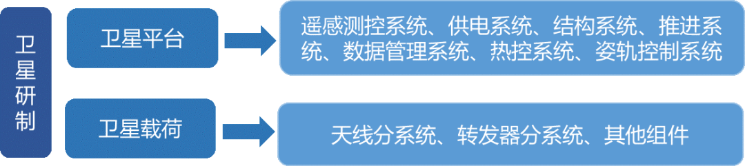 (三)国企民企齐发力,合力推动产业快速发展 我国卫星互联网产业起步晚,面对稀缺且不可再生的轨道资源,正在加快产业布局。一方面,国家积极整合优势资源,2021年在雄安注册成立中国卫星网络集团有限公司(星网集团),致力于建设一个更加庞大的低轨卫星移动通信与空间互联网系统。另一方面,形成以航天科技、航天科工、中国卫星等国家队引领,银河航天、九天微星、航天宏图、和德宇航等民营企业积极参与的多元化卫星互联网产业格局,推动技术创新、商业化发展和行业繁荣。 四、卫星互联网产业链情况 卫星互联网核心产业的产业链主要包含卫星研制、卫星发射、地面设备、卫星运营及服务四大环节。向上延伸主要为材料、燃料、电子元器件,向下延伸主要为应用环节。 图2 卫星互联网产业链 (一)卫星研制环节及代表企业 卫星研制环节包括卫星平台、卫星载荷,具体细分领域如下。 图3 卫星研制产业全景图 在卫星研制环节,航天科技、航天科工作为国家队,承担着多个卫星项目,包括高分系列遥感卫星、北斗导航卫星和气象卫星等研发和制造。民营队包括银河航天、九天微星等企业。其中,银河航天是国内商业卫星互联网的第一家独角兽企业,目前已经发射8颗试验卫星,组建星地融合5G试验网络“小蜘蛛网”。九天微星专注于小型卫星的研制和应用,率先实现民营企业百公斤级卫星的自主研制及在轨验证。 (二)卫星发射环节及代表企业 卫星发射环节包括火箭制造和发射服务,具体细分领域如下。