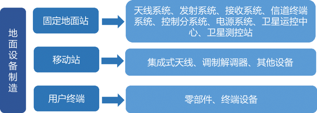 图4 卫星发射产业全景图 2015年以后,涌现出一批民营火箭公司,如蓝箭航天、零壹空间、星际荣耀、深蓝航天、星河动力、天兵科技、中科宇航等,与中国航天科技和中国航天科工一起,推动中国商业火箭的创新和发展。2023年以来,中国民营火箭企业共计成功发射7次,其中,蓝箭航天的朱雀二号(遥二)是全球首枚成功入轨的液氧甲烷火箭,展现中国商业航天的实力和潜力。 (三)地面设备环节及代表企业 地面设备主要包括固定地面站、移动式地面站(静中通、动中通等)以及用户终端,具体细分领域如下。