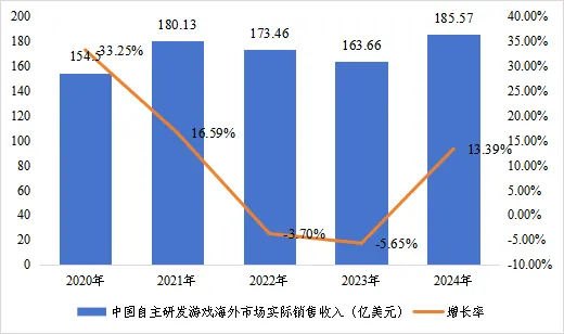 图 1 近五年中国自主研发游戏海外市场实际销售收入及增速