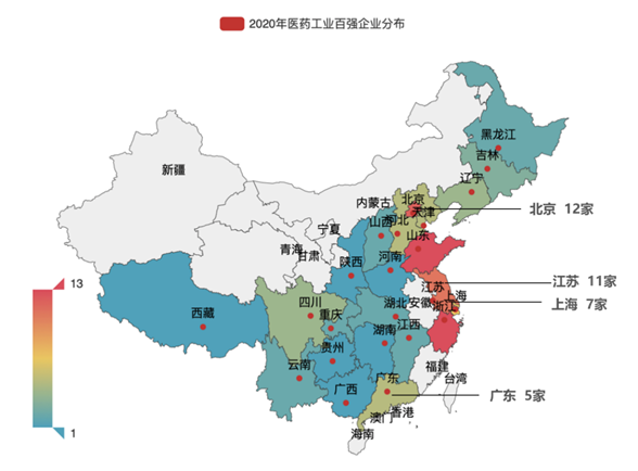 图3 2020年中国医药工业百强企业分布热力图