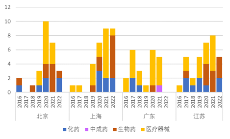 从上市企业看,北京布局多元化,上海和江苏生物药领域表现亮眼,广东医疗器械实力领先。北京在不同领域都有实力强的上市药企,如中药领域有同仁堂集团,化药领域有悦康药业,生物药有天坛生物,器械有万东医疗等。但近几年上海和江苏生物药企业发展更胜一筹,2022年上海有6家生物药企业上市,江苏近三年保持每年有3家生物药企业上市。广东药品企业上市呈下降趋势,但医疗器械企业表现突出,自“十二五”以来上市数量最多,共计18家。