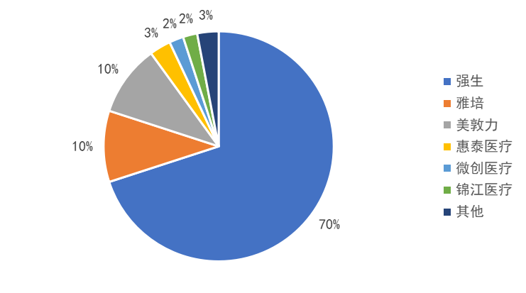 脑血管介入器械(又称神经介入器械)是指治疗中枢神经系统血管疾病的微创医疗器械。美敦力作为全球脑血管介入器械行业的引领者,进入中国市场20余年,以其全球领先的高技术产品占据国内60%市场份额。而国内品牌如微创神通、心玮医疗、沛嘉医疗、归创通桥等多以生产微导管类、微导丝类等通路类产品为主。