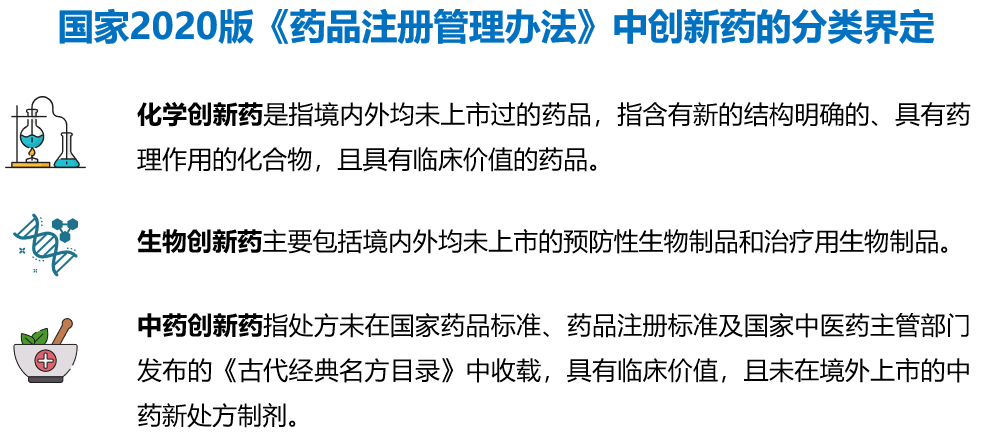 创新药也称原研药,相对于仿制药而言,是指从机理开始源头研发,具有自主知识产权,具备完整充分的安全性有效性数据作为上市依据,首次获准上市的药物。国家2020版《药品注册管理办法》对创新药进行了分类界定。