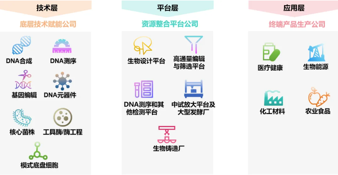 伴随生物学、生物信息学、计算机、化学等学科的快速发展,合成生物在经济社会中加速应用渗透,逐步用于加工或合成化学品、药品、食品、生物能源等产品,为解决资源短缺、环境污染等问题提供了新的解决方案。根据不同类型企业在合成生物相关产业中的不同作用,可以大致将产业链条分为技术层、平台层、应用层三个层级。