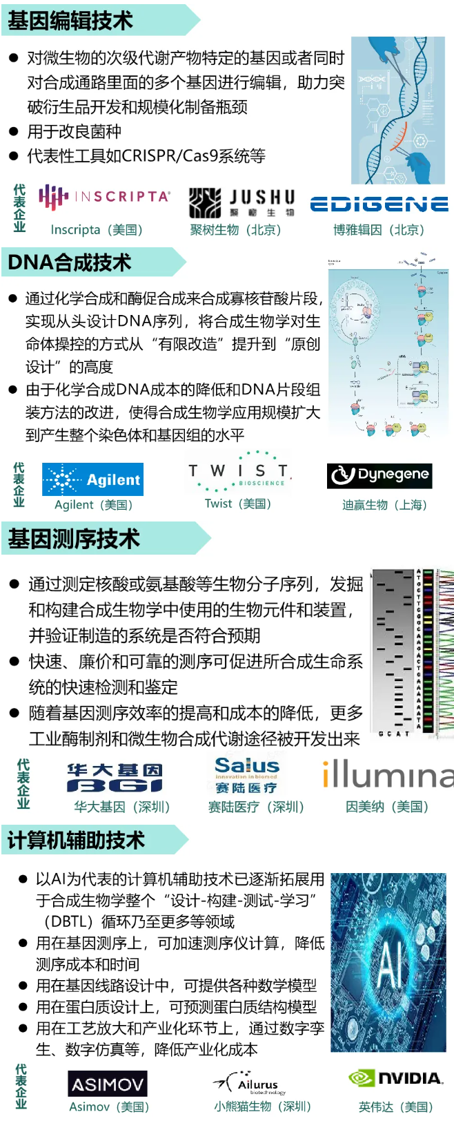 技术层的主要技术是指基因合成、基因编辑、蛋白质设计、细胞设计、高通量筛选等颠覆性使能技术,是支撑和推动合成生物学发展的关键。其中,基因组编辑技术、DNA合成以及基因测序是核心使能技术,此外,计算机辅助技术对合成生物学的推动作用也日益显现。