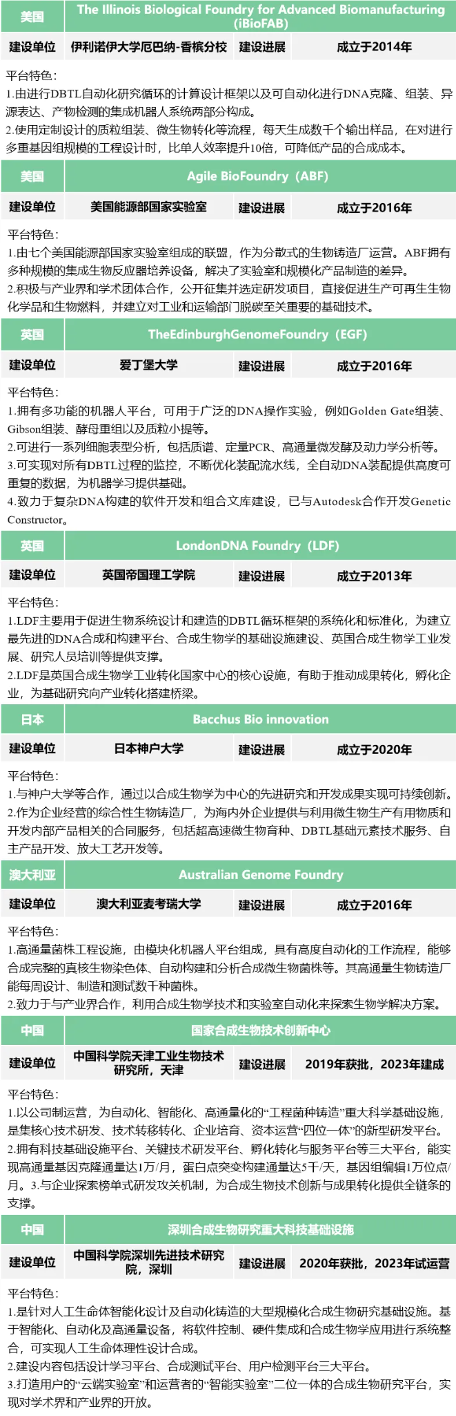 注:资料来自国际合成生物设施联盟(Global Biofoundry Alliance,GBA)公开信息。该联盟于2019年5月9日在日本成立,由美国劳伦斯伯克利国家实验室、英国帝国理工学院、中国科学院深圳先进技术研究院等来自全球8个国家的16所顶尖合成生物设施机构联合发起。截止2024年2月,共有35所成员单位,其中中国有5所。