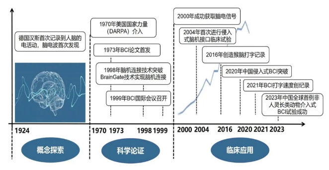 脑机接口在医疗领域的应用是其发展的第一推动力,目前主要经历了概念探索、科学论证和临床应用3个阶段。1924年,脑电波的首次发现为大脑研究奠定了基础。1970年,美国组建团队开始进行脑机接口相关研究,各国团队也相继开展探索,实现了刺激范式、脑机连接等技术突破。进入21世纪后,随着科学论证的不断完善、神经科学与相关技术的不断突破,各国纷纷开展脑机接口的战略布局,侵入式BCI技术和非侵入式BCI技术都有了较大的进展,如2004年实现了通过侵入式脑机接口控制机械臂,2019年非侵入式解码器将大脑信号转化为语音信号。相关专利量、论文发表量呈现爆发性增长,涌现了Neuralink等一批初创公司,概念应用产品相继推出。此外,随着认知/协同BCI等新范式的不断涌现,其应用也从临床医学向娱乐游戏、汽车等多元化领域拓展,逐渐形成产业化趋势。