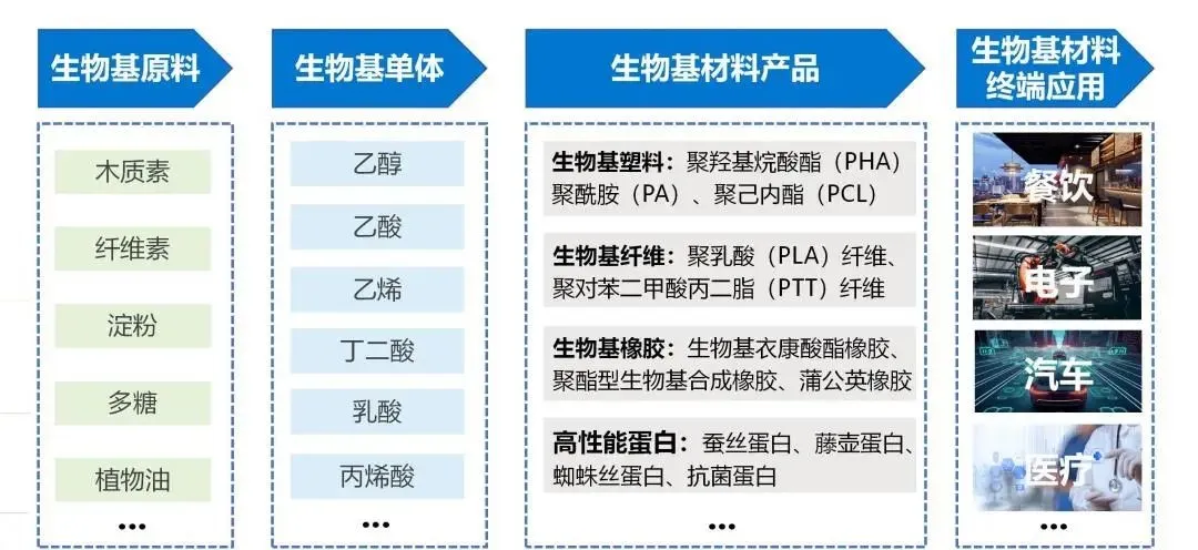 生物基材料已形成涵盖“原料-单体-材料产品-终端应用”的新型材料产业链。原料层主要涉及生物质资源的收集、加工与转化,生成植物油、木质素、纤维素、淀粉、多糖等原料。单体层重点是将上游原料经过生物合成、生物加工、生物炼制过程获得生物醇、有机酸等生物基单体,以及乳酸、丁二酸等生物基平台化合物,为生物基材料产品制备提供基础。产品层重点是通过聚合反应和加工过程生产的各种生物基材料,如生物基塑料、生物基纤维、生物基橡胶等。终端应用层则是生物基材料产品的应用场景,涉及医疗、电子汽车、食品包装、餐饮等多个领域。