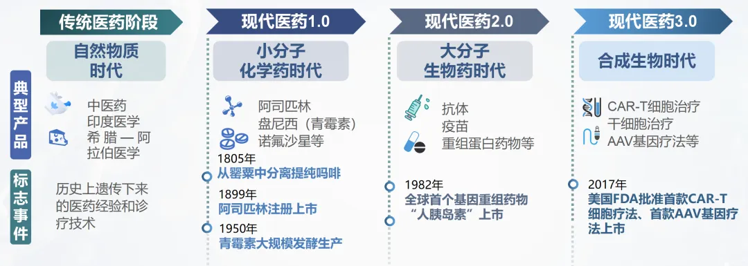 在生命科学技术加速演进的驱动下,医疗健康产业经历了从传统到现代、从经验到科学的四个阶段的演变过程,当前已经进入现代医药3.0时代。随着高通量基因测序、CRISPR-Cas基因编辑等技术的快速更新迭代,合成生物这把探索生命奥秘的新钥匙,与医疗健康的融合更加紧密,实现了从“造物致知”到“造物致用”的进阶式发展。