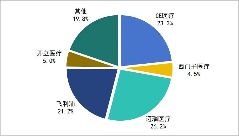 我国US市场规模约180亿元,GE医疗(26%)、迈瑞医疗(24%)、飞利浦(24%)三家企业合计占据市场75%以上份额。随着设备更新落地,国产品牌市场份额占比明显提升,截至2024年三季度,US国产品牌占比提升至41%(迈瑞医疗26%、开立医疗5%,其他10%),GE医疗、飞利浦分别下降至23%、21%,预计2024年第四季度以及2025年上半年,随着迈瑞医疗、开立医疗等企业参与更多设备更新采购,国产品牌市场份额将进一步快速提升。