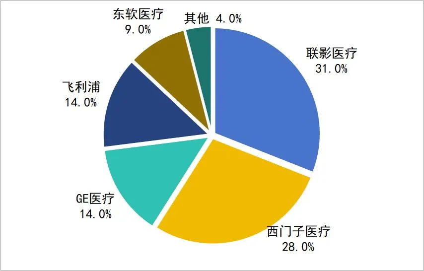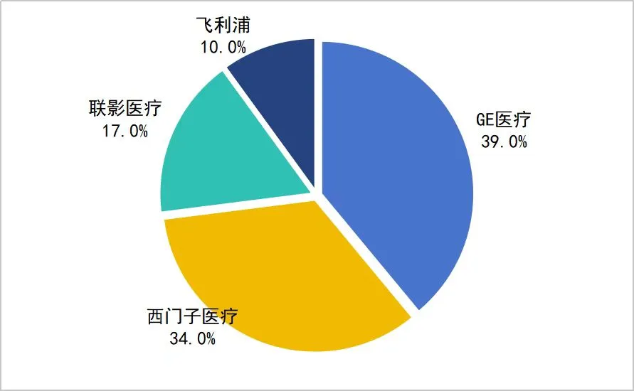 MR主要包括MR(1.5T)和MR(3.0T)两种。其中,MR(3.0T)以其更高的信噪比、空间分辨率和扫描速度,极大提升了诊断精度,临床应用日益广泛,占据MR总体市场超52%的市场份额,且市场份额高度集中,GE医疗(39%)、西门子医疗(34%)、联影医疗(17%)三家企业合计市占率近90%。联影医疗、东软医疗加速入局本次医疗设备更新,提升MR国产化率,其中东软医疗以1.5T产品为主,联影医疗在主导1.5T市场份额的基础上强势进军3.0T市场。