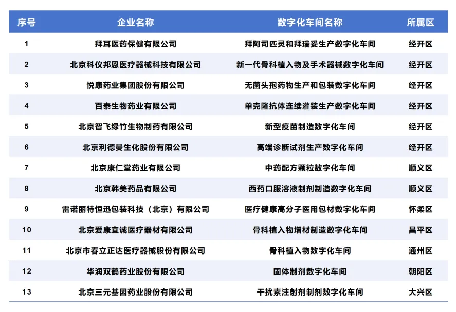 表1 2022—2024年北京市生物医药领域数字化车间认定名单