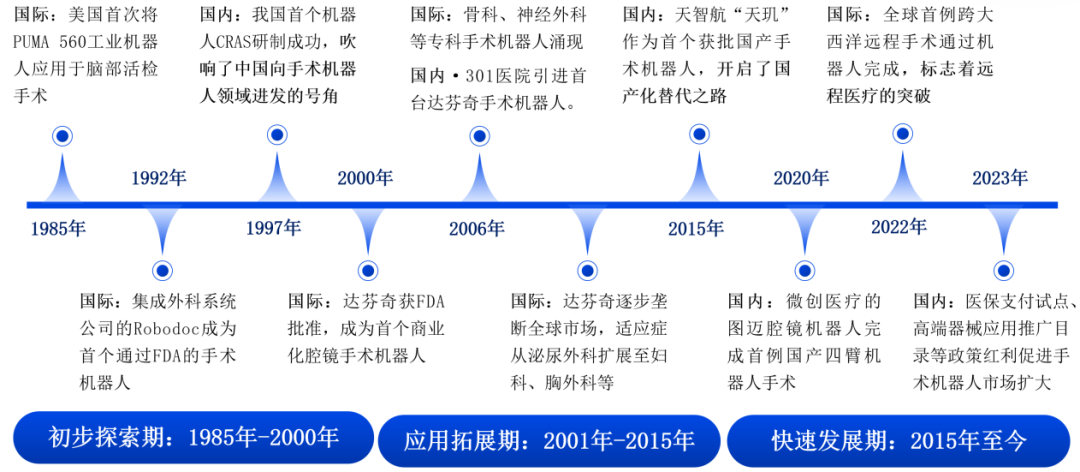 从行业发展生命周期角度看,手术机器人历经了早期探索、应用拓展、快速发展三个主要时期。