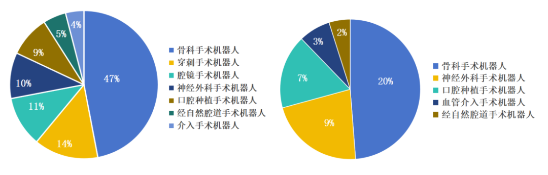 从获批数量看,骨科手术机器人获批50余款,占比近50%,远超其他类型机器人,腔镜、神经外科、穿刺机器人均获批10款左右。从市场份额看,腔镜手术机器人以其更高的产品价格和临床应用科室位列第一,占比近60%,其次是骨科手术机器人,占比20%。
