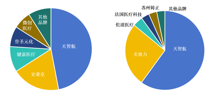 国内累计获批超50款,包括关节置换、脊柱外科机器人等,装机量约200~300台。其中,天智航天玑是国内首款骨科机器人,部分性能比肩甚至超过进口产品,可实现脊柱、关节、创伤手术全覆盖,占据一半以上市场,手术应用量已超过11万例;史赛克、美敦力分别于2018年、2021年进入中国市场,依托动态稳定性、力反馈精度和AI辅助决策等技术优势分别发力关节和脊柱领域,约占国内20%市场;佗道医疗、键嘉医疗等新兴企业依托多术式、场景适配等优势加快入院。