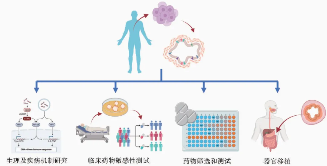 类器官模型为遗传性疾病、感染性疾病、肿瘤治疗等提供“可视化”且可大规模培养的实验平台,器官芯片可以进一步连接多个器官模块,模拟器官间的信号传递和转移机制,识别潜在的疾病治疗靶点,推动疾病机制基础研究向临床转化。现阶段,已实现脑、肝、肺、胰腺、胃肠道等多器官正常或病变类器官的模拟构建。