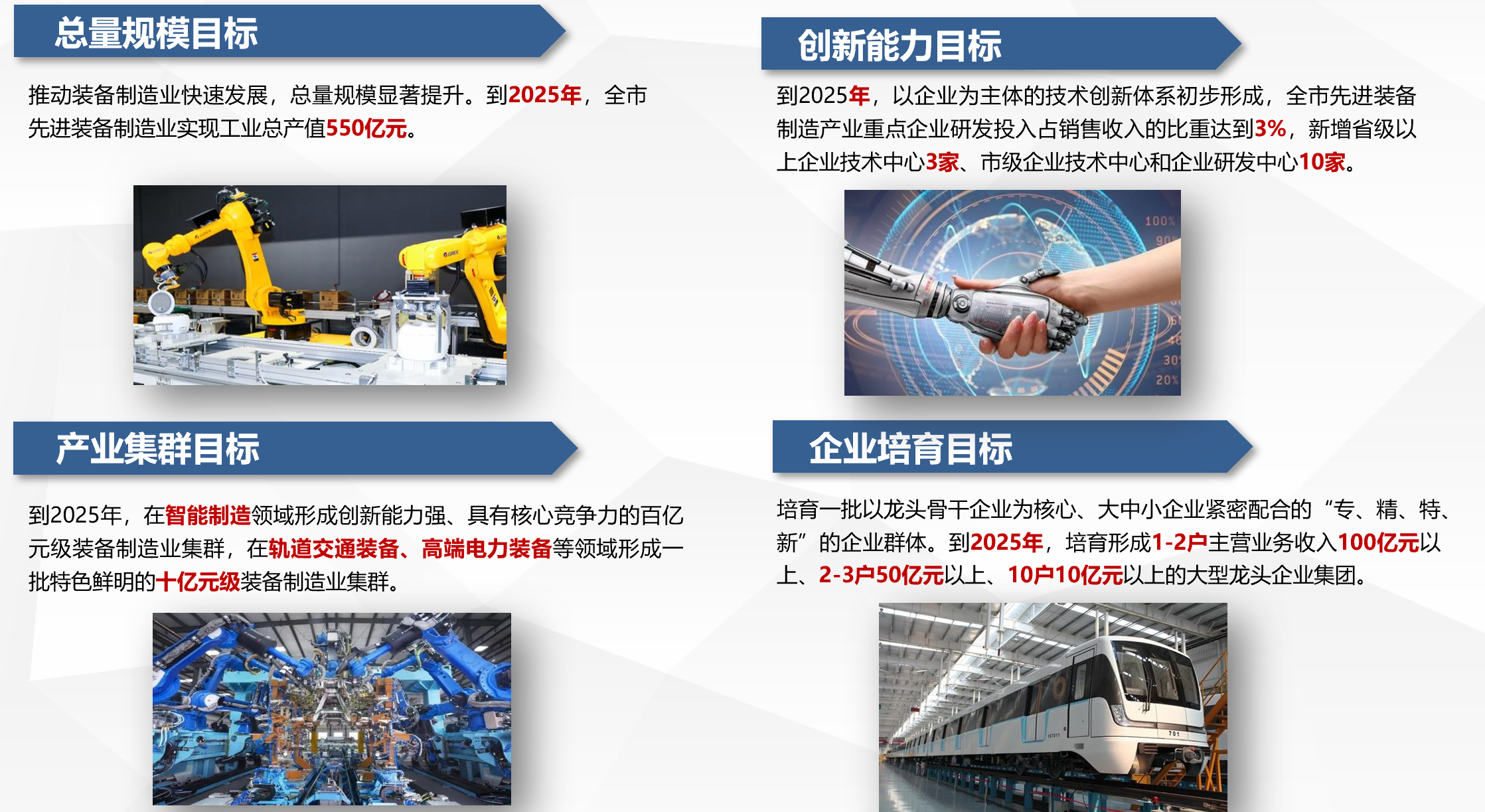《北京市装备制造产业振兴规划》、《北京亦庄机器人产业创新示范区产业发展规划》、《昆明市先进装备制造业发展规划(2016-2020年)》《河北省遵化市应急装备特色产业集群发展规划(2019年—2025年)》、《北京市轨道交通产业发展规划》